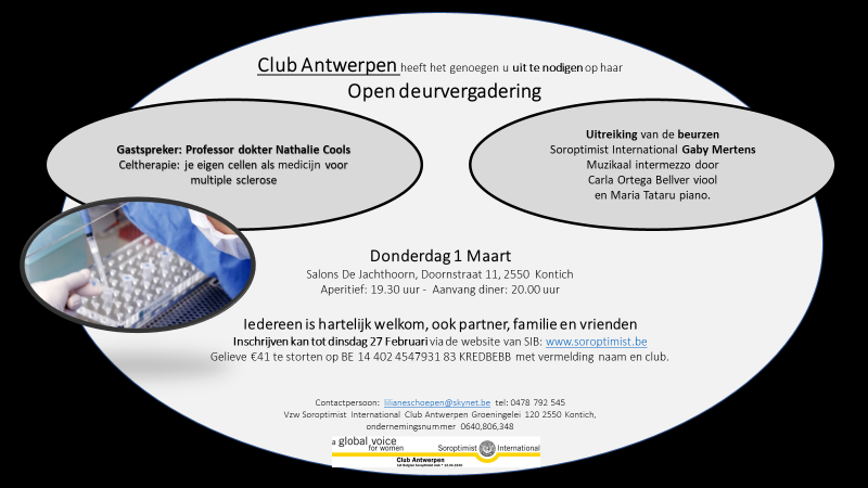 Uitreiking beurzen Soroptimist international “Gaby Mertens” Onze club was heel blij met de talrijke opkomst van zowel leden als niet-leden voor het boeiende en gevarieerde programma van de open vergadering. Het deed ons ook veel plezier onder de talrijke aanwezigen mevrouw Nicky Flandre en echtgenoot van club Antwerpen Anthos te mogen verwelkomen. |